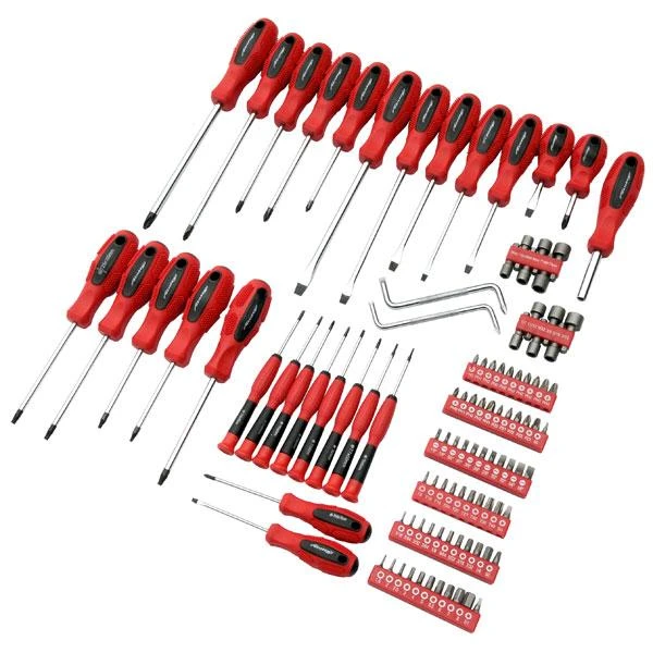 8PCS Precision Screwdriver: Slotted: 3/32″ x 2″, 1/8″ x 2″ Phillips: PH00 x 2″, PH0 x 2″ Torx: T6 x 2″, T7 x 2″, T8 x 2″, T10 x 2″ •19PCS Screwdriver: Slotted: 1/8 ” x 3 “, 5/32 ” x 4 “, 3/16 ” x 3 “, 1/4 ” x 4 “, 1/4 ” x 6 “, 5/16 ” x 6 “, 1/4 ” x 1-1/2 ” Phillips: PH0 x 3 “, PH1 x 3 “, PH1 x 4 “, PH2 x 4 “, PH2 x 6 “, PH3 x 6 “, PH2 x 1-1/2 ” Torx: T15 x 3 “, T20 x 4 “, T25 x 4 ” Square Recess: S1 x 3″, S2 x 4″ •64PCS CR-V Bits (Slotted, Phillips, Pozi, Square, Hex and Torx) •12PCS Nut Driver Set : 1/4 “, 11/32 “, 9/32 “, 3/8 “, 5/16 “, 7/16 “, 6mm, 7mm, 8mm, 9mm, 10mm, 11mm, •2PCS Offset Screwdriver •1 PC 1/4” Hex Bit Driver •Supplied with storage pouch •Material: Blade:Carbon Steel, Bits:Cr-v